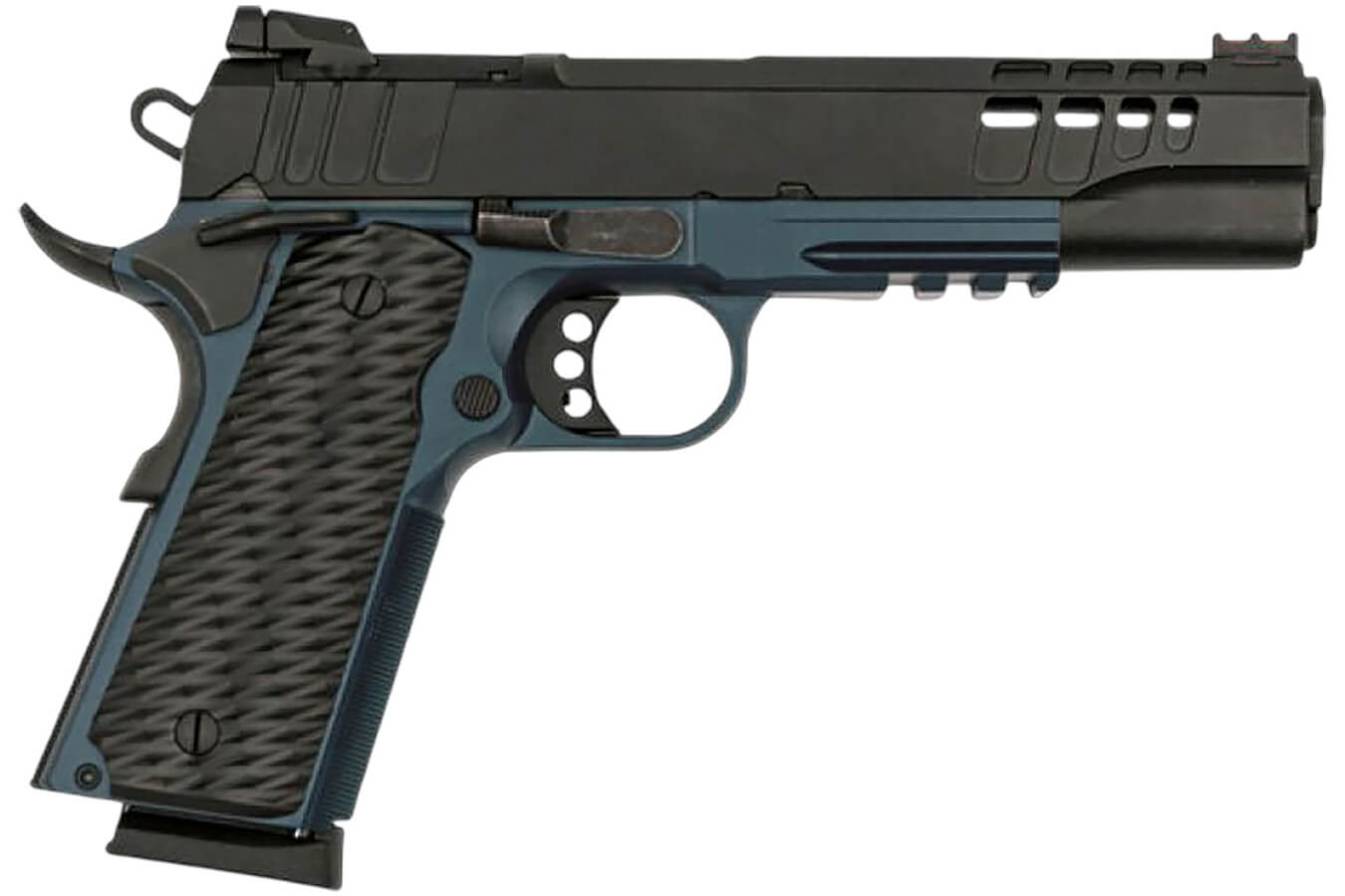 The 1911 Government pistol features a 5″ stainless steel, Match Grade barrel; Blue Titanium Cerakote lower frame; black Cerakoted ported, hexagonal slide with RMSc footprint; High Viz Target Iron sights; Picatinny rail; extended ambidextrous manual safeties; textured front grip with custom side grip panels. Includes two 8-round magazines.