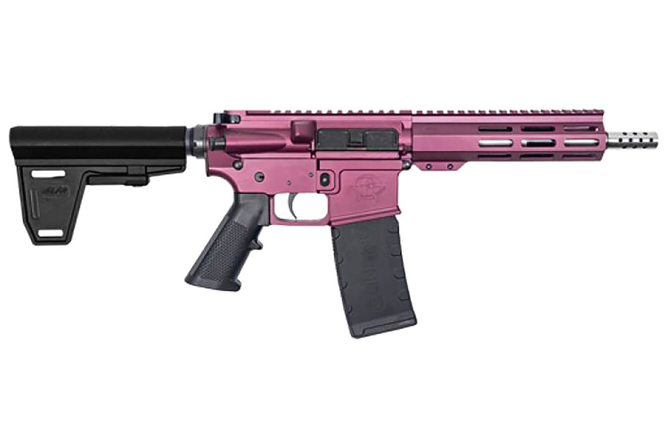 Great Lakes tactical pistol features an M-LOK handguard; Picatinny rail; aluminum billet upper and lower receiver; threaded stainless barrel with muzzle brake; Black Cherry Cerakote finish; polymer mil-spec grip and trigger. Includes magazine.